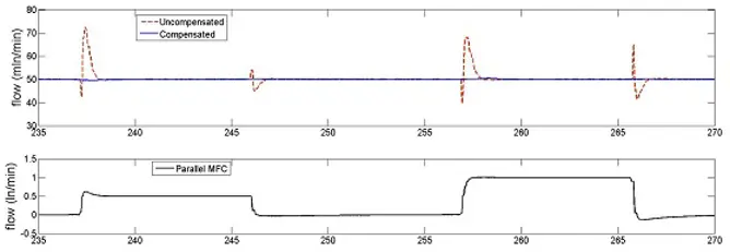 Unter dynamischer Druckkompensation verstehen wir eine Kompensationsmethode für schnelle Änderungen im Druck. Diese Druckänderungen treten z.B. auf, wenn ein Durchflussregler mit höherem Durchfluss auf derselben Versorgungsleitung seinen Sollwert ändert. Dies erzeugt starke Fluktuationen im Fließdruck. Dieser unerwünschte Effekt, auch bekannt als Cross-Talk, kann einen Prozess immens stören. Sobald integrierte Drucksensoren diese schnellen Druckänderungen erkennt, wird die Ventilregelung entsprechend justiert und der Durchfluss stabilisiert.