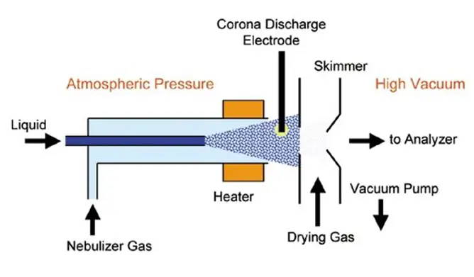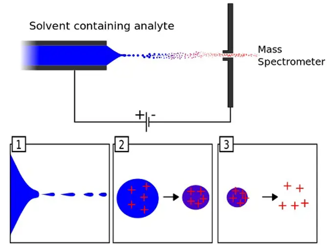 Über einen zweiten Gasstrom senkrecht zum Aerosol-Strom werden die Tröpfchen soweit wie möglich verdampft, so dass die Ladungen in den Tröpfchen anfangen sich gegenseitig so stark abzustoßen, dass sich zunächst kleinere Tröpfchen bilden (Coulomb-Explosion), bis irgendwann die Ionen in die Gasphase übergehen. Die geladenen Ionen werden nun mittels einer Potentialdifferenz zwischen der Sprayer-Kapillare und einer Düse, die als Gegenelektrode fungiert, in das Massenspektrometer gelenkt. Dort werden die Ionen entsprechend ihres m/z-Verhältnisses abgelenkt und detektiert.