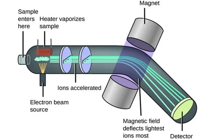 Ein Massenspektrometer wird oft mit einer Waage für Moleküle verglichen. Jedes Molekül ist aus Atomen aufgebaut und jedes Atom hat eine bestimmte Atommasse. Diese Masse wird mittels eines Massenspektrometers detektiert. Bevor die Masse aber bestimmt wird, müssen die einzelnen Bestandteile eines Moleküls voneinander separiert werden. Dabei wird ein Molekül nicht komplett in seine Bestandteile zerlegt, sondern zunächst in die Gasphase gebracht und ionisiert, also mit einer Ladung versehen. Anschließend werden diese Ionen dann in einem elektrischen Feld beschleunigt. In einem Magnetfeld werden die Ionen nun in Abhängigkeit von ihrem Verhältnis Masse zu Ladung (m/z - Verhältnis) abgelenkt. Je leichter ein Ion ist, desto stärker die Ablenkung im Magnetfeld und damit die Änderung der Flugbahn.