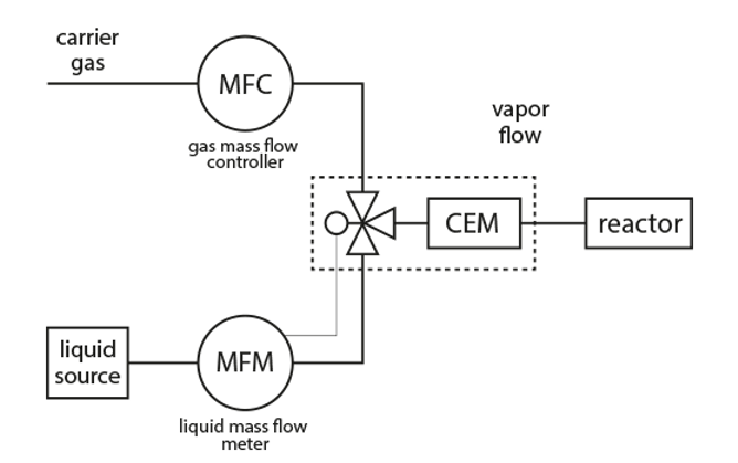 Eine Möglichkeit, die oben genannten Hindernisse zu überwinden, besteht darin, ein CEM (Controlled Evaporation & Mixing)-System für die Dampfzufuhr zu verwenden. In diesem Dampfsystem stellt ein Gas-Massenstromregler (wie das EL-FLOW Select-Modell) einen genau gesteuerten Trägergasfluss bereit, während ein Flüssigkeits-Durchflussmesser mit PID-Regelung (wie ein mini CORI-FLOW oder LIQUI-FLOW) den Durchfluss der zu verdampfenden Flüssigkeit misst und steuert, zum Beispiel aus einem Druckbehälter als Vorlage. Das Flüssigkeitsregelventil, das auch als 3-Wege-Aktuator fungiert, ist dafür verantwortlich, winzige Flüssigkeitsmengen zu dispergieren und mit dem Trägergas zu vermischen.