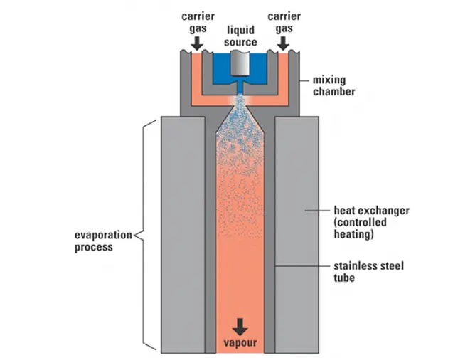 Eine traditionelle Methode, einen Dampf dem Prozess des Kunden zuzuführen, besteht darin, ein Blasensystem zu verwenden („Bubbler“). Hierbei wird ein Gasstrom durch ein beheiztes Gefäß geleitet, das mit der zu verdampfenden Flüssigkeit gefüllt ist. Dieser Trägergasstrom wird vollständig oder teilweise mit dem Dampf der Verbindung gesättigt, und dieser Dampfstrom wird vom Trägergas zum Prozess des Kunden weitergeleitet.