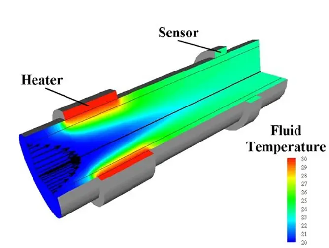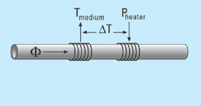 Ein thermischer Massendurchflusssensor nutzt die thermischen Eigenschaften von Flüssigkeiten, um ihren Massendurchfluss zu messen. Zu diesem Zweck, wie in der obigen Abbildung dargestellt, wird Wärme durch ein Heizelement in die strömende Flüssigkeit eingebracht, und der (Temperatur-)Sensor misst, wie viel Wärme von der Flüssigkeit absorbiert wird. In diesen thermischen Massendurchflussmessern für Flüssigkeiten sind das Heizelement sowie der Sensor in einem rostfreien Rohr ohne bewegliche Teile oder Hindernisse im Inneren des Rohrs angeordnet. Der gesamte Durchfluss geht durch dieses Rohr.