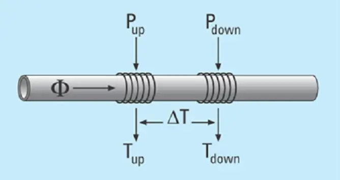 Die Heizelement-/Sensoranordnung ist um das Rohr herum angeordnet, und durch Anwendung des CTA-Prinzips wird ein konstanter Temperaturunterschied (ΔT) erzeugt. In der aktuellen Konfiguration fungiert das erste Element als Temperatursensor, und das zweite Element (stromabwärts) arbeitet als Heizelement, wie in Abbildung A dargestellt. Das Heizelement wird auf einen bestimmten konstanten Temperaturunterschied (ΔT) über der Mediumstemperatur erhitzt. Die tatsächliche Massendurchflussrate wird berechnet, indem die variable Leistung gemessen wird, die erforderlich ist, um diesen konstanten Temperaturunterschied aufrechtzuerhalten, während die Flüssigkeit am Sensor vorbeifließt.