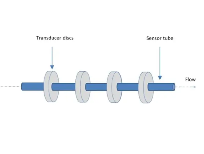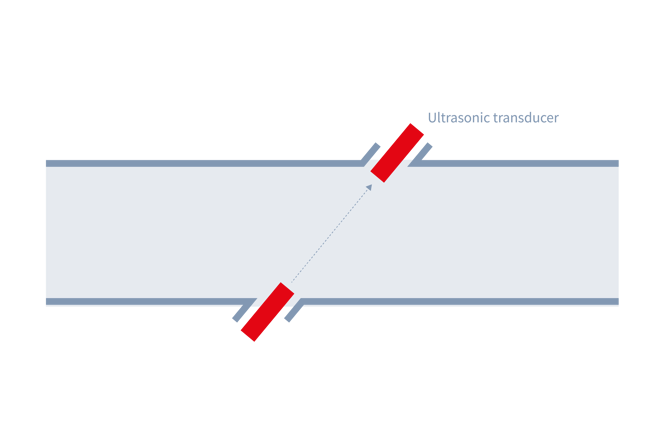 Eine weitere konventionelle Möglichkeit, Ultraschall zur Durchflussmessung zu verwenden, die nicht auf Partikeln in der fließenden Flüssigkeit beruht, besteht darin, einen Ultraschallsender an einer Seite eines Flüssigkeitsrohrs zu positionieren und einen Sensor diagonal gegenüber. Bei einem Flüssigkeitsfluss durch das Rohr ist der Unterschied in der Laufzeit der Ultraschallwelle vom Sender zum Sensor in aufwärts und abwärts gerichteter Richtung ein direktes Maß für die Fließgeschwindigkeit der Flüssigkeit. In Kombination mit dem bekannten Querschnitt des Rohrs wird der Volumenstrom berechnet.