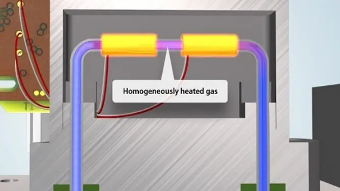 Nur ein Teil des Gasstroms fließt durch den Sensor und wird dabei von zwei Heizelementen erhitzt (RHT1 und RHT2). Der Gasstrom, der durch den Durchflusssensor fließt, verhält sich proportional zum Gesamtdurchfluss durch das Gerät. Da die Temperatur im Sensor homogen verteilt ist, sind nur die Durchflussmenge, die Dichte und die Wärmekapazität des Gases für das Durchflussausgangssignal entscheidend (Q, ρ, Cp).