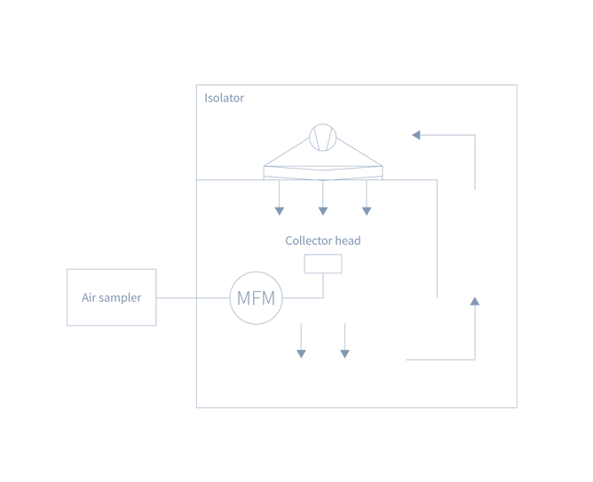 A Bronkhorst MASS-STREAM mass flow meter is used to calibrate the air flow in the microbial air samplers used in the isolators. To this end, the flow meter is connected in series in between the collection head and the air sampler, so that the same controlled air flow goes through both devices. By comparing the read-out of the controlled flow from the air sampler with that of the flow meter, calibration is conducted by correcting the read-out of the former to the latter. In this setup calibration is done at 100 l/min.
